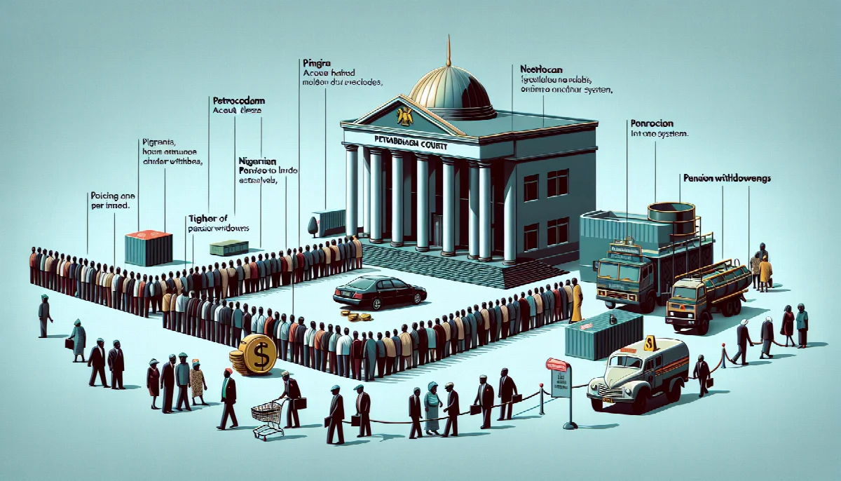 Federal High Court orders account freeze for Petrocam Trading and its principal over alleged ₦9.05 billion debt to Zenith Bank, while Alexander Forbes processes over 100,000 pension withdrawals in five days, causing technical strain.
